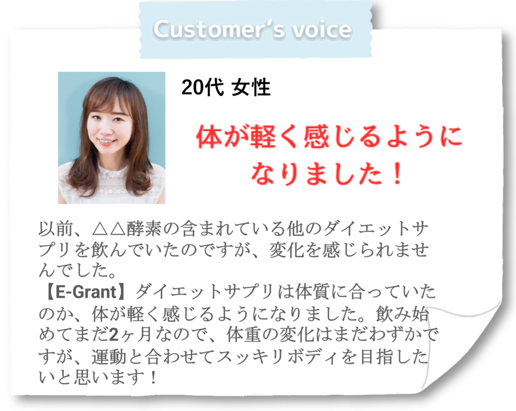 最後に、【E-Grant】ダイエットサプリご愛用の皆様からのお喜びの声を紹介させていただきます。