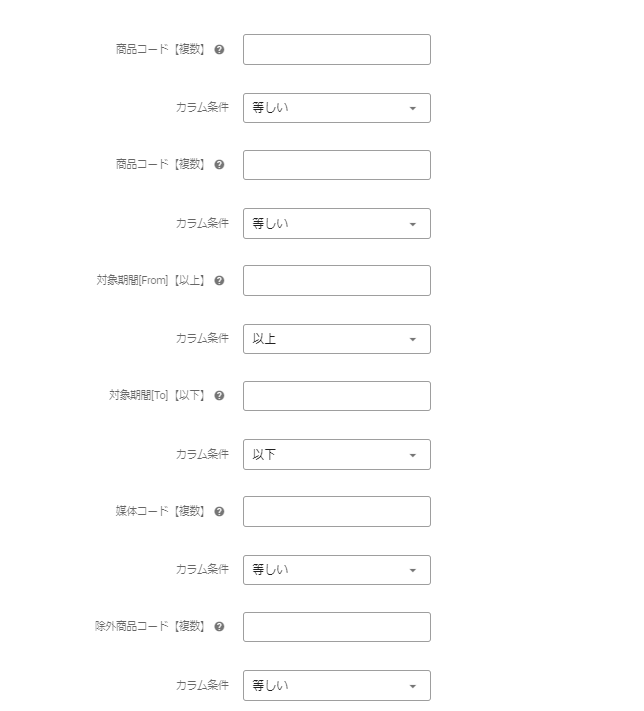 ※商品コードを複数入力する場合は、カラムを「等しい」→「複数」へ変更してください。