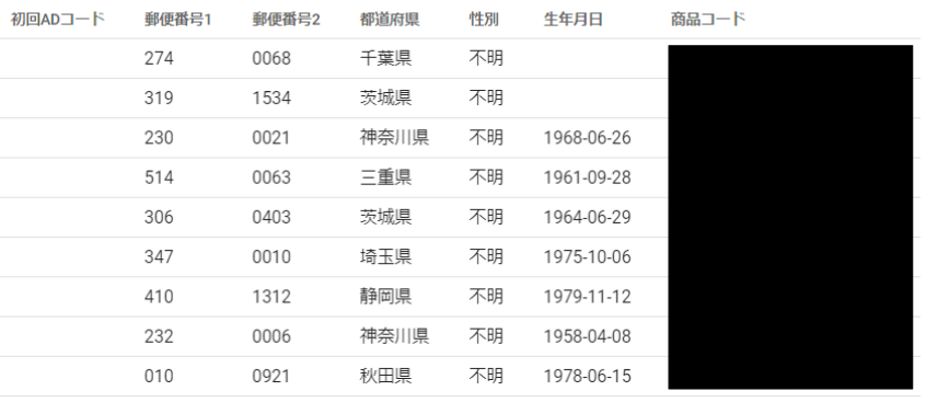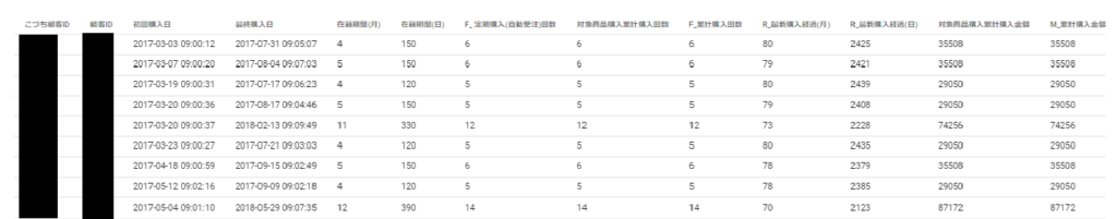 顧客の商品毎に「初回購入日」「購入回数」「最終購入日」等を表示します。