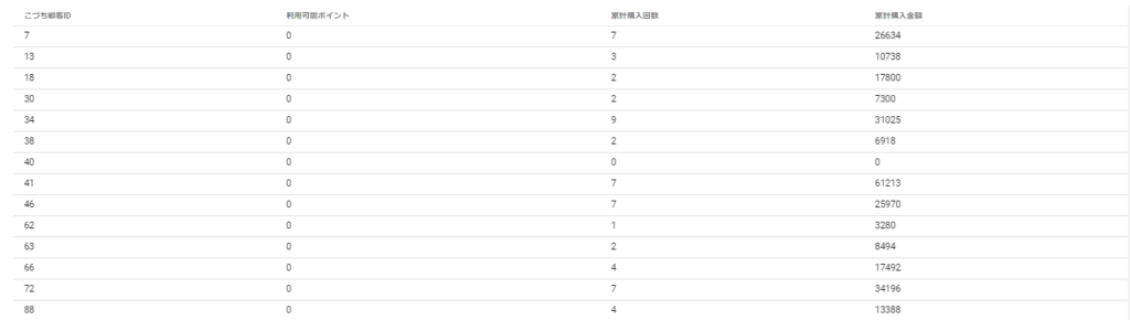 こづち顧客ID、利用可能ポイント、累計購入回数、累計購入金額 の4項目です。