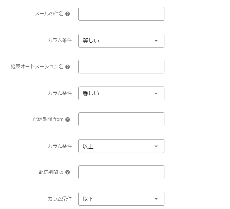 メールの件名、施策オートメーション名、配信期間を条件として指定でき、