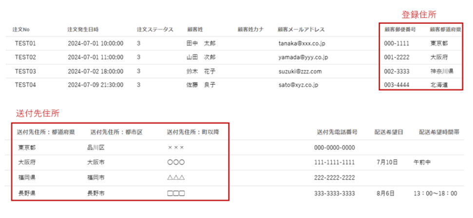 注文データの情報を取得し、登録住所と配送先の住所が異なる注文を抽出します。