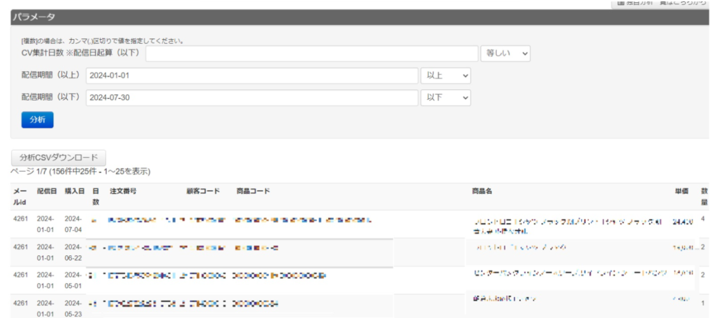 メールクリック後に購入している商品の把握が顧客(顧客コード)ごとに把握することができます。