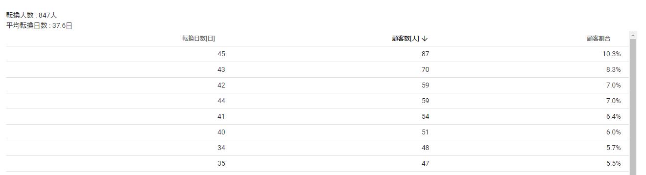 表中の「転換日数【日】」「顧客数【人】」「顧客割合」を押下すると、