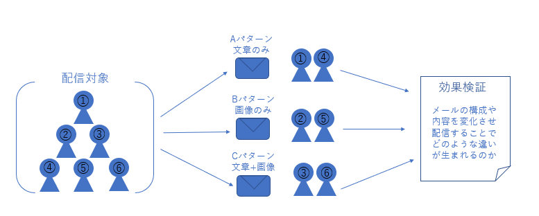 指定した配信対象が自動的に振り分けられ、開封率やクリック数の多い効果的なメール内容はどれか検証するのに役立つ機能です。