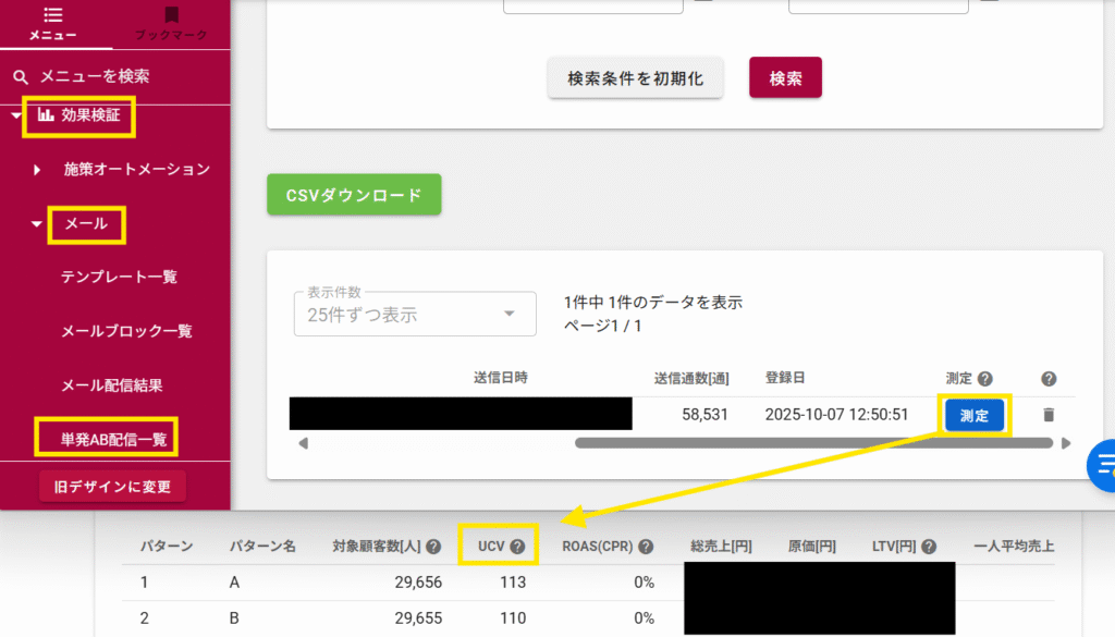 「測定」を押下し表示される「メールAB効果測定」画面で確認できる【UCV】は、