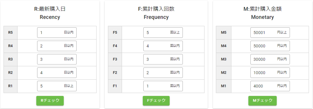 RFMの各項目を5段階でセグメントするための数値を設定できます。