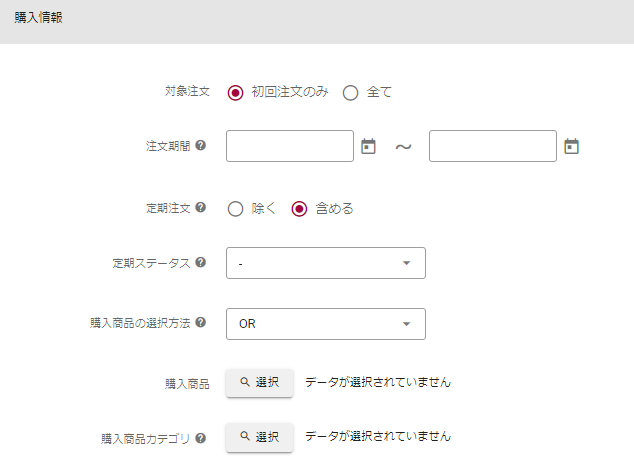 ※「購入商品カテゴリ」にAND条件は適用されません。「購入商品カテゴリ」を複数選択した場合は、
