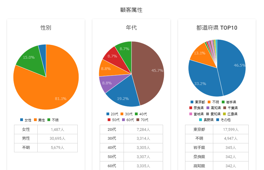 押下すると顧客の性別、年代、都道府県TOP10、メール配信可・不可、