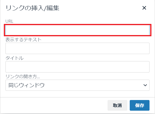 挿入したURLをドラッグして選択し、リンクボタンを押下後、リンクURLに遷移先のURLを入力します。