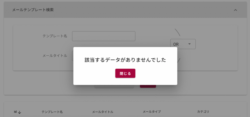 「テンプレート選択」からテンプレートを選ぼうとしたところ、「該当するデータがありませんでした」と表示されてしまいます。