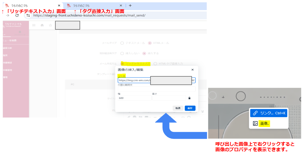 大変お手数ですが、別タブにて「リッチテキスト入力」の画面を開き、画像URLのコピーをお願いいたします。