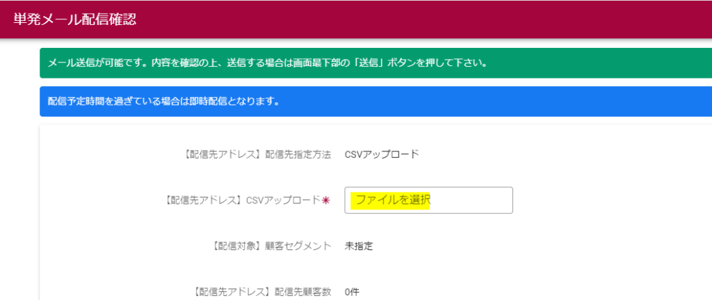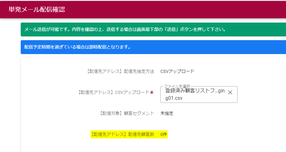 配信先アドレスで「CSVアップロード」を指定した場合、単発メール配信確認画面で「【配信先アドレス】配信先顧客数」が0件になります。