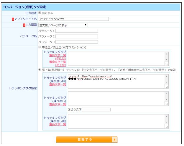 「うちでのこづち」の「コンバージョン計測タグのコピー」でコピーしたタグを