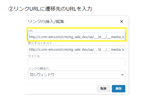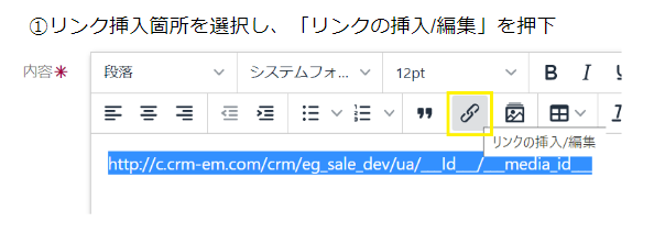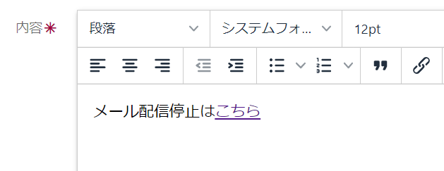 挿入したURLをドラッグして選択し、リンクボタンを押下後、リンクURLに「メール解除URL」を入力します。