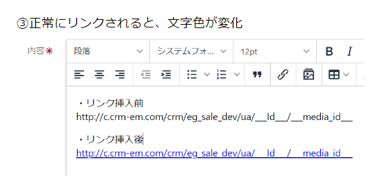 テキスト形式のURLだと、ページに遷移することができません。そのため、リンク挿入を行います。