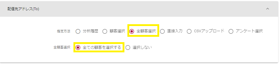 ※配信先アドレスで、分析履歴・顧客選択・全顧客選択を指定した場合のみ有効です。