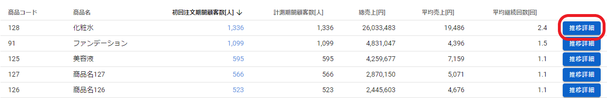初回注文顧客数の一番多い商品の「推移詳細」を押下します。