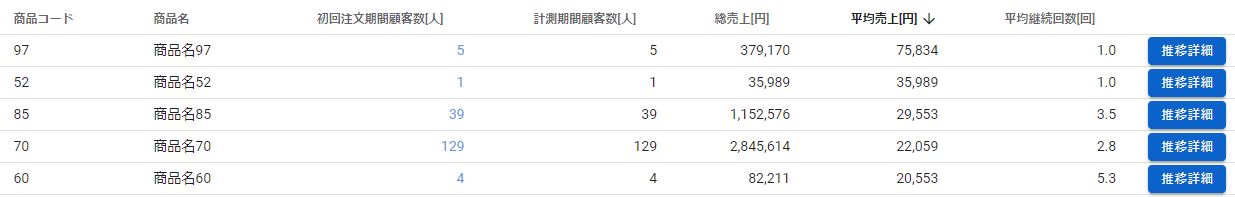 「分析」を押下すると、各商品の初回購入後365日間の「総売上」「平均売上」「平均継続回数」といったLTVが表示されます。