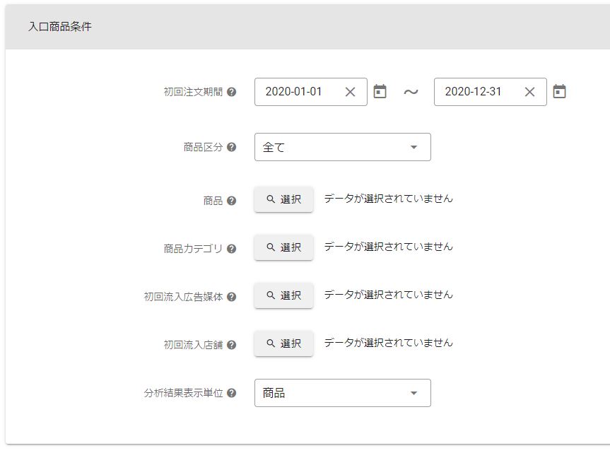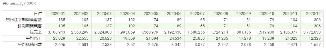 この例題の場合、2020年1月から2020年12月に「化粧水」を初回注文商品として購入した顧客の、