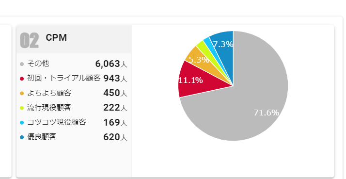 「CPMパラメータ設定」にて設定した顧客ランクの名前のことです。初期設定では優良客、コツコツ客、よちよち客、初回・トライアル客と設定されていますが、自社の指標に合わせて変更できます。