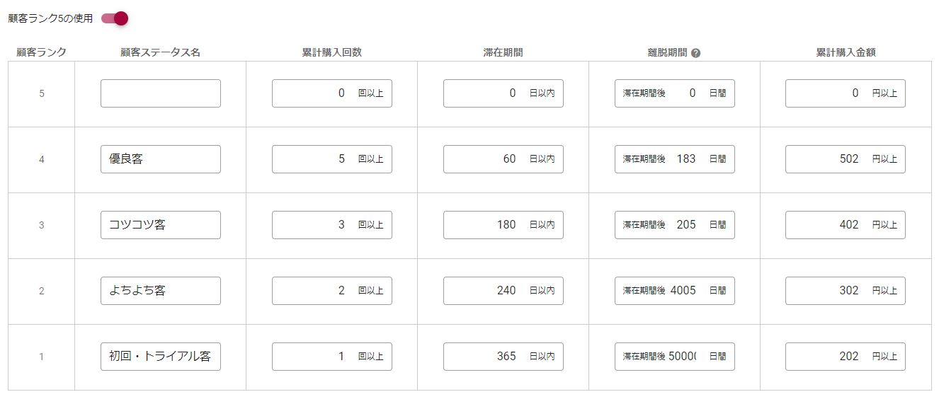 顧客ランクは5段階設定もしくは4段階設定することができます。
