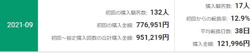 2021年1月と2021年9月の初回購入顧客数や、初回~指定購入回数の合計購入金額等を比較します。