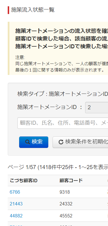 確認した時点で、対象の施策オートメーションに流入中の顧客を一覧で表示します。