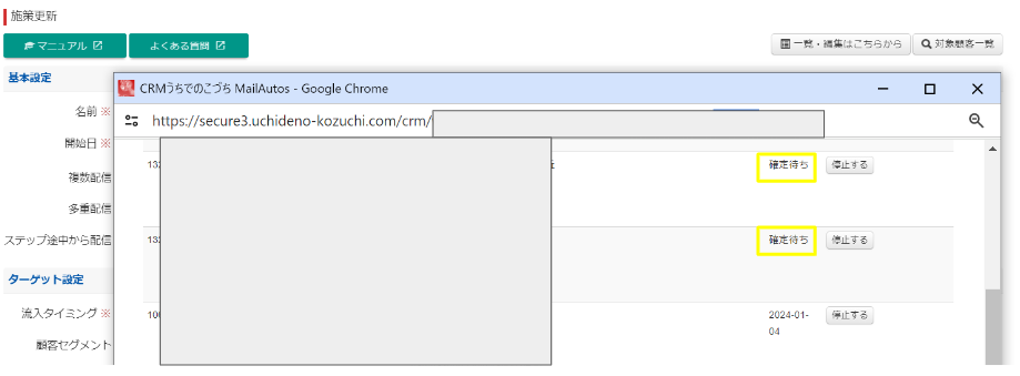 施策オートメーションの更新をかけていない場合(「更新」ボタンを押下していない場合)は、