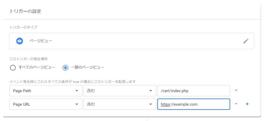 3.トリガーの設定 > このトリガーの発生場所: 「一部のページビュー」を選択