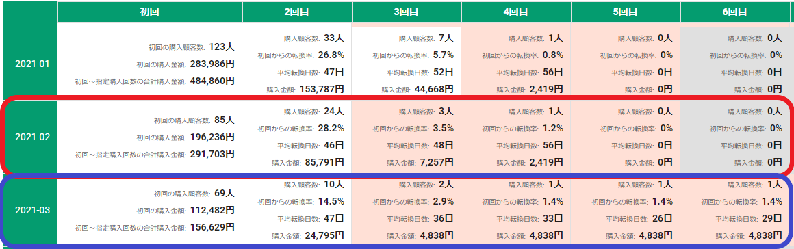 (例)商品Aについて、2021年2月と3月に初回購入した顧客のその後の転換率や購入金額を比較する