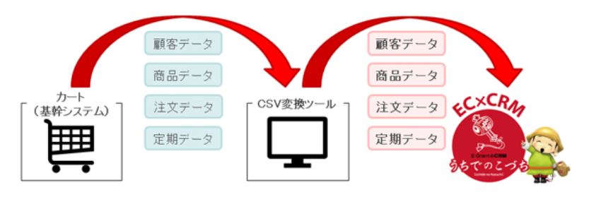 「うちでのこづち」は基本的に、毎日深夜(2時~4時頃)に前日分の顧客情報・注文情報・商品情報・定期情報(定期は注文情報から)をCSVデータで取得しています。