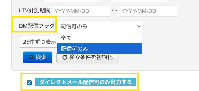① プルダウン「DM配信フラグ(全て/配信可のみ)」