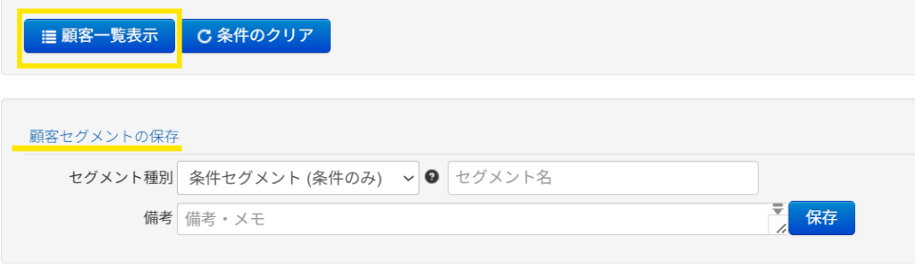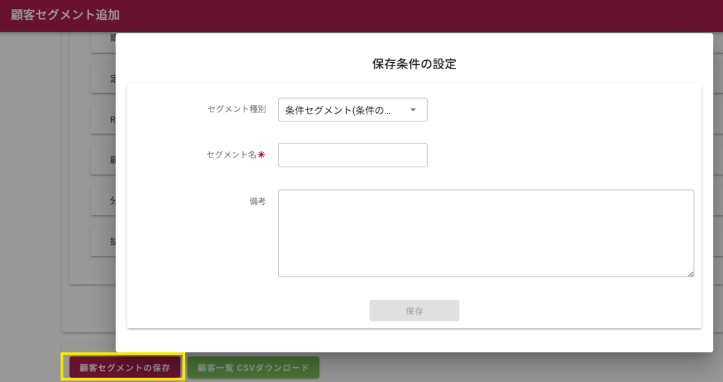 「顧客一覧表示」を押下すると、「顧客セグメント保存」のメニューが表示されます。