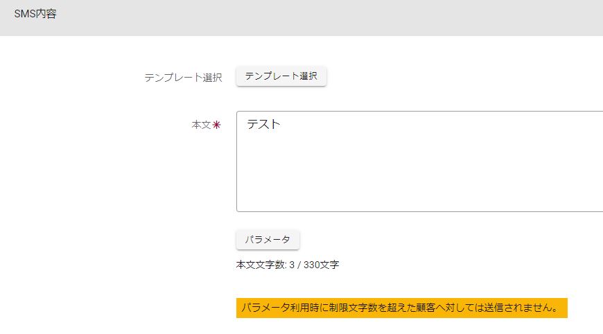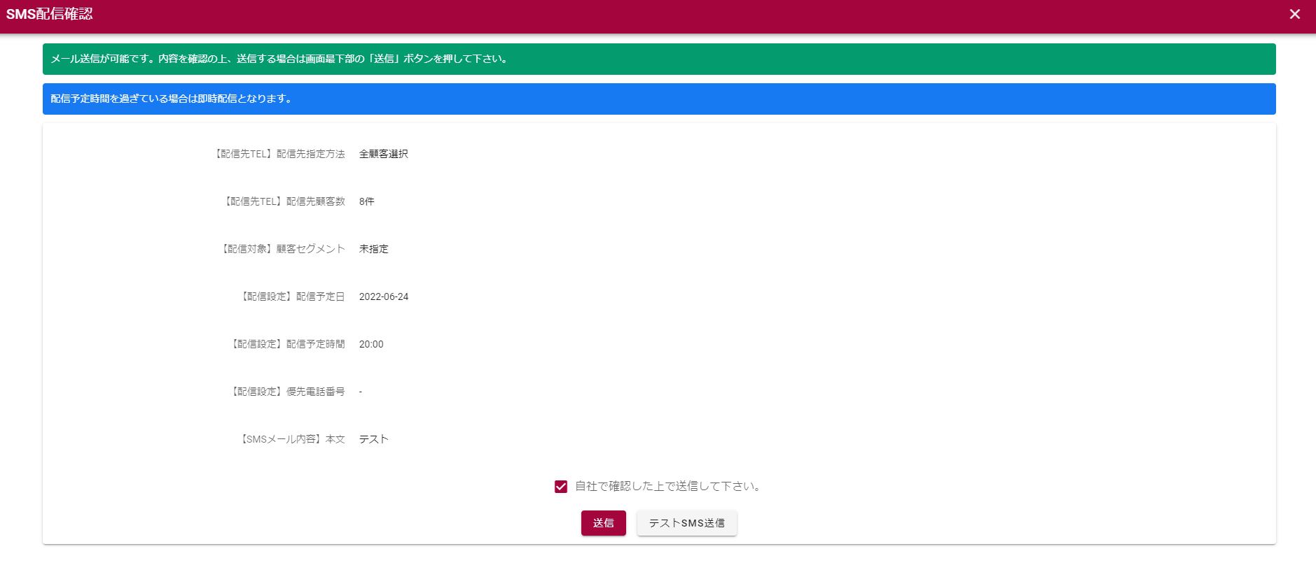 テスト送信を行うため、「テストSMS送信」を押下します。