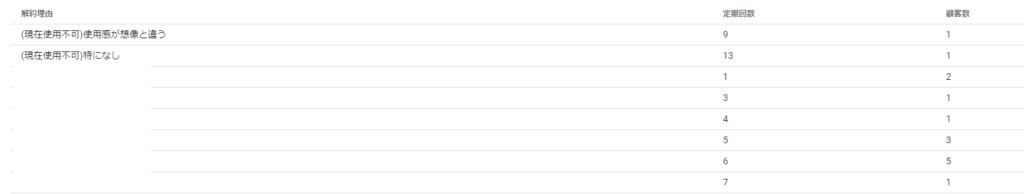 これにより各購入回数ごとの解約理由の傾向が把握可能になり、