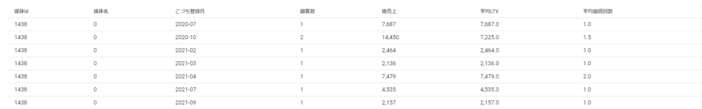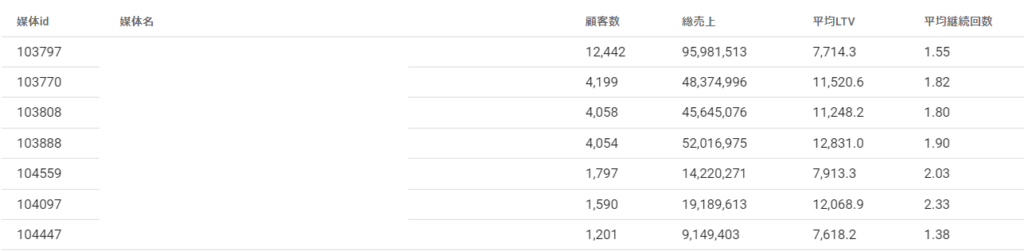 初回流入媒体ごとに、初回購入月から12か月間の総売上や平均LTVなどを算出します。
