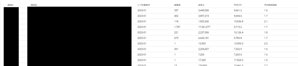 初回流入媒体ごとに、初回購入月から6か月間の総売上や平均LTVなどを算出します。