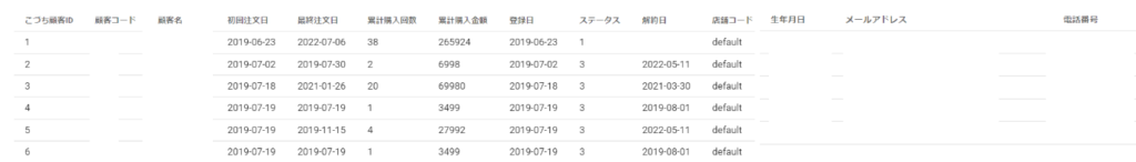 各顧客の購買店舗・購買商品・初回注文日・最終注文日・累計購入回数・累計購入金額を一覧で確認することができます。