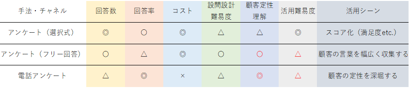 顧客と直接会話をする方法のため、上記に挙げた方法の中で最も回答率や顧客定性の理解が得やすいです。