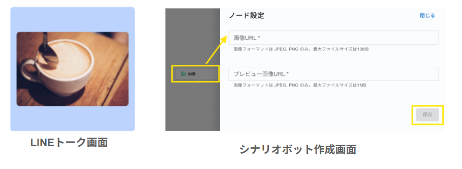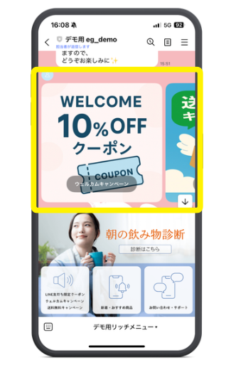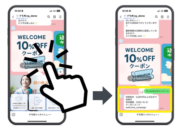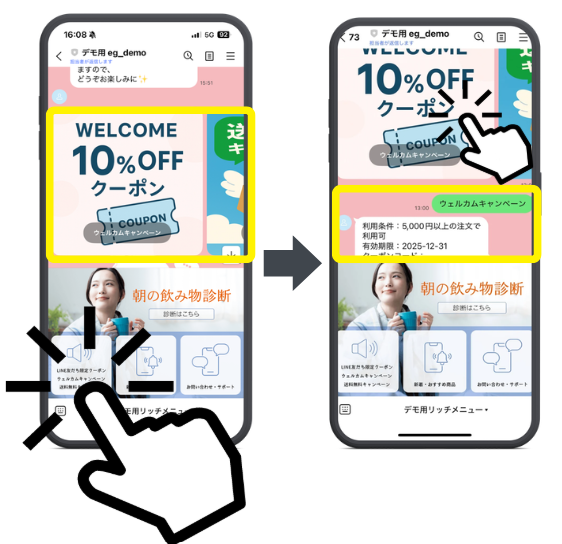 対象画像を押下すると、入力したテキストがLINEトーク画面上に表示され、次のアクションに繋げます。
