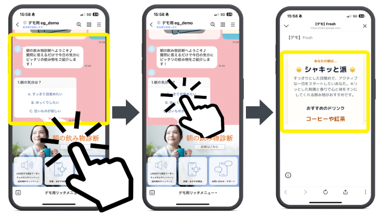 回答内容に応じて、商品提案やレシピ紹介など次のアクションにつなげられます。