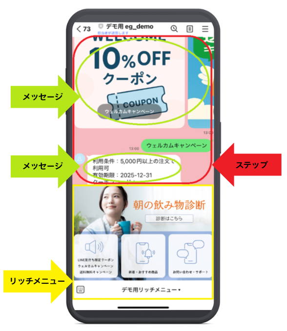 ステップ内でトーク画面に個別に表示される文章や案内を指します。