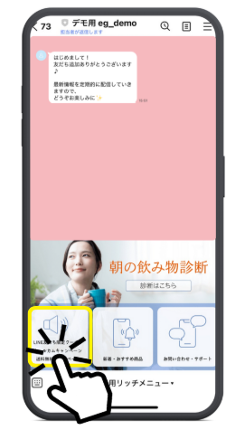 「LINEリッチメニュー」のボタンが押下されたときに、あらかじめ設計したシナリオ(会話フロー)をトーク画面に自動配信できる機能です。