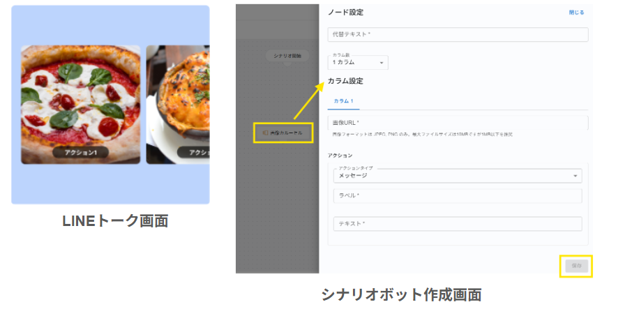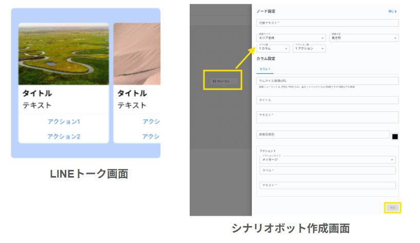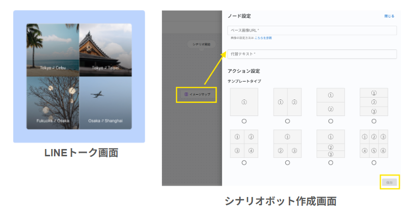 シナリオの中で選択肢を表示し、ユーザーがタップした内容に応じて次のメッセージや案内内容を出し分けることができます。