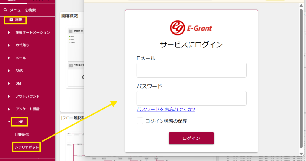施策 > LINE > シナリオボット を押下すると、ログイン画面が別タブで表示されます。