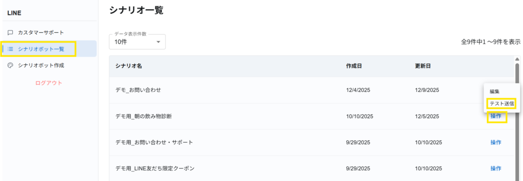 シナリオボット一覧画面から、保存したシナリオボットの「操作」>「テスト送信」を押下します。