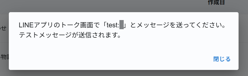 LINE トーク画面上で、ポップアップ内に表示されている 「test:〇〇」 をそのままメッセージ送信してください。