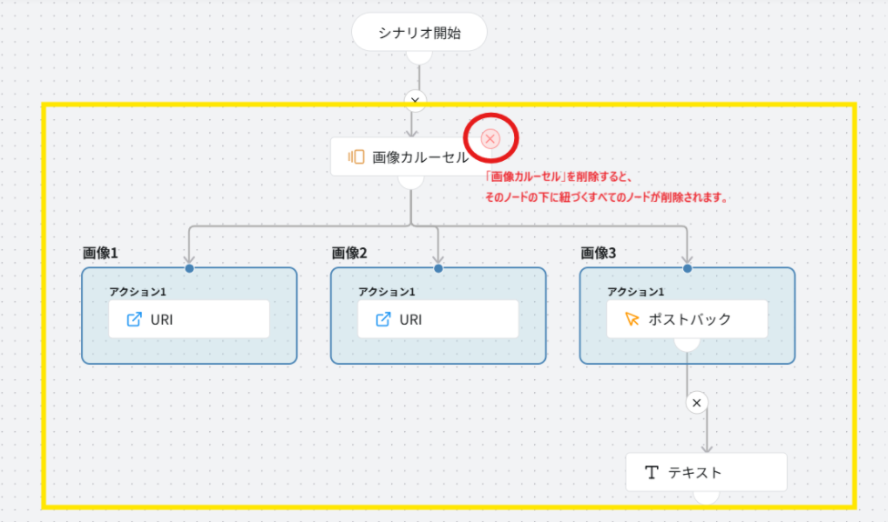 ノードの削除は、対象のノードにマウスをホバーすると削除ボタンが表示されます。
