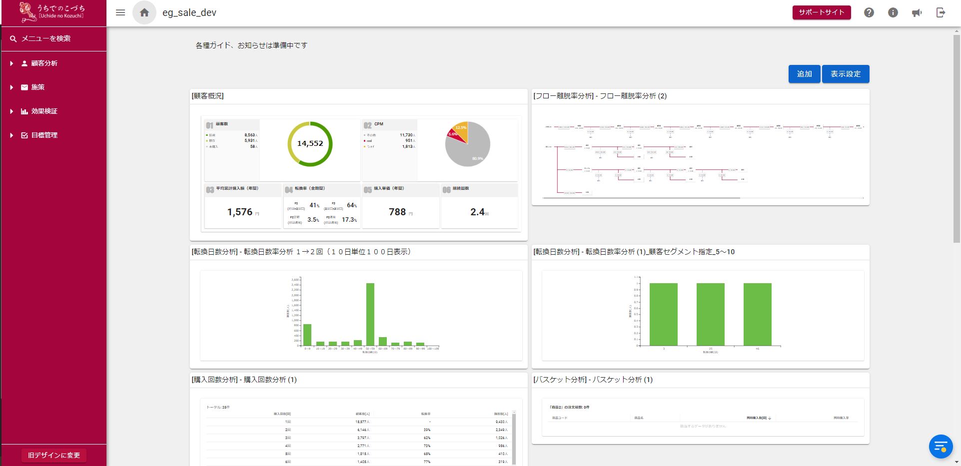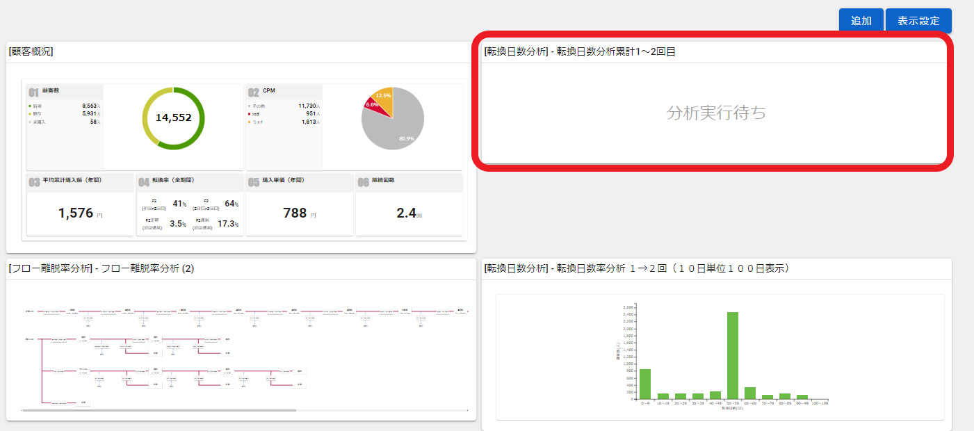 うちでのこづち画面にログインした際に一番最初に表示される、顧客概要や各種分析結果の一覧表示機能です。頻繁に確認する分析機能などをダッシュボード上に登録しておくことで、毎度分析設定を行う手間を省き、一目で分析結果を確認できます。
